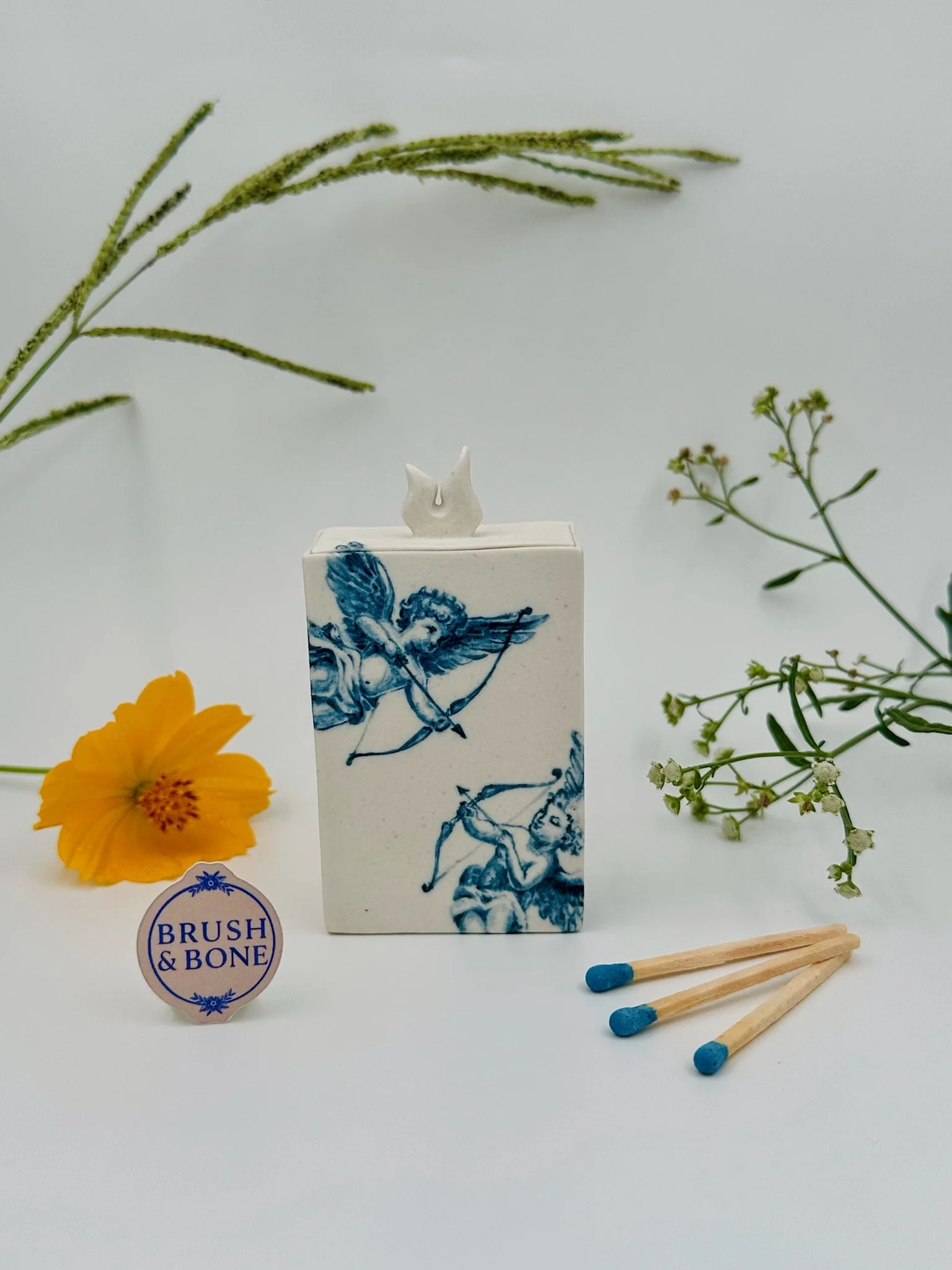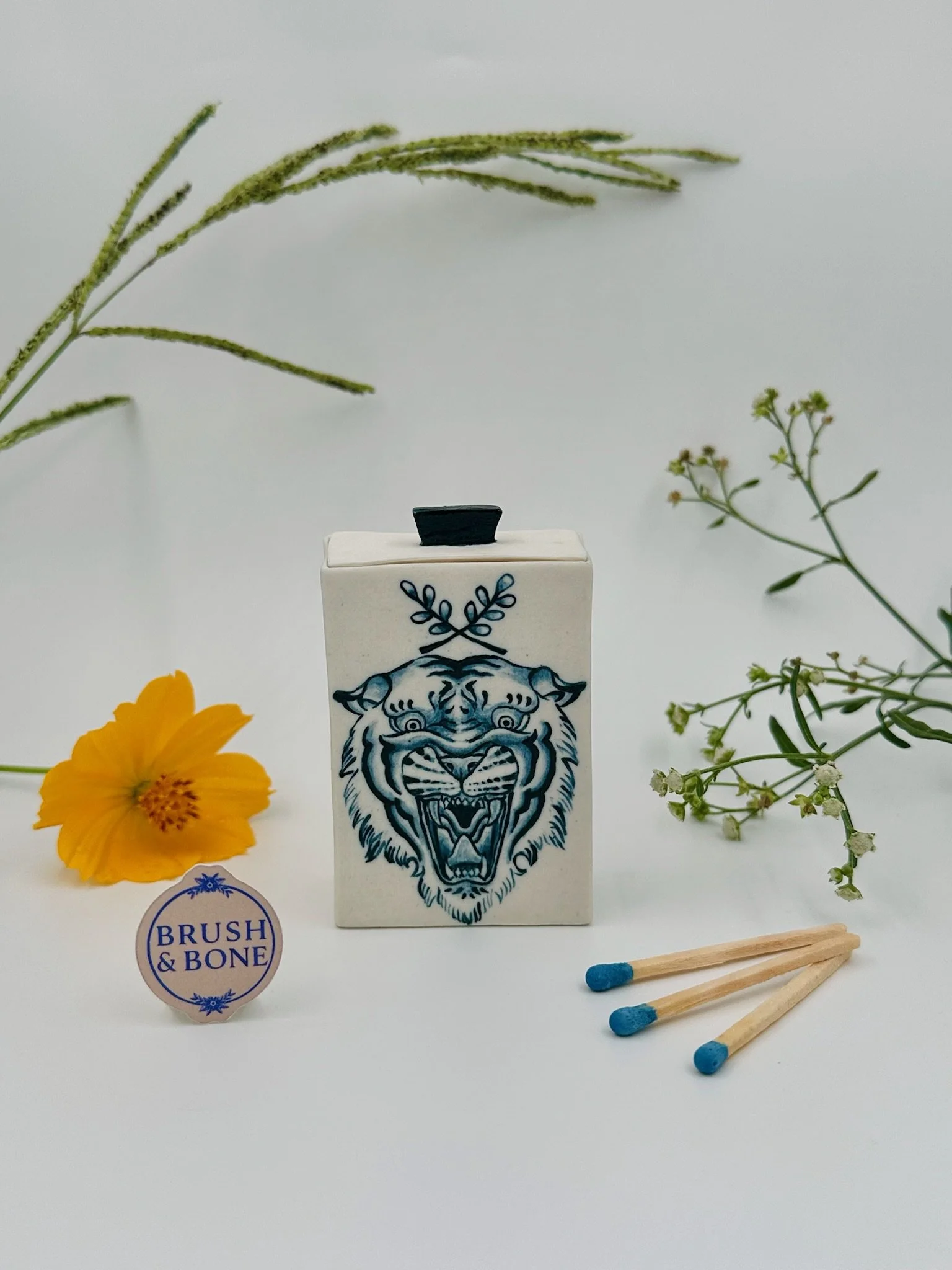 Introducing our first series, Ashes to Ashes, featuring handmade matchboxes. Each box is hand built from 1/8 inch thick slab and meticulously pieced together. The designs on every matchbox are inspired by popular American and Japanese Traditional tattoos, while maintaining a delicacy that balances the gentle features of the boxes themselves.